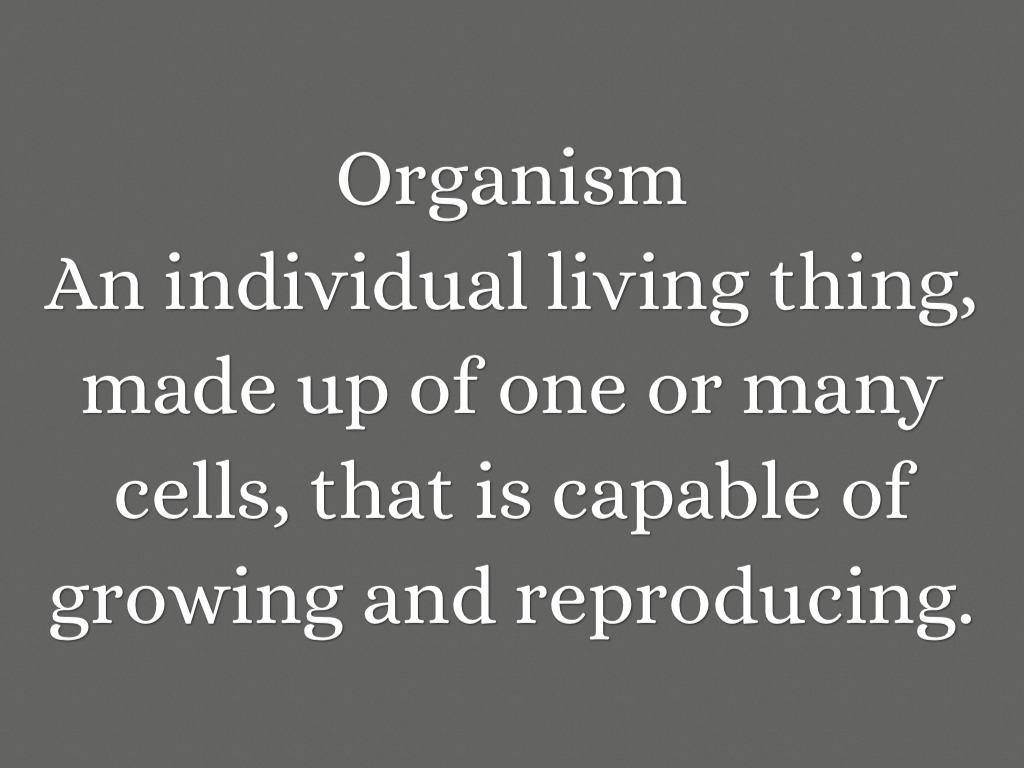 An individual living thing, made up of one or many cells, that is capable of growing and reproducing.