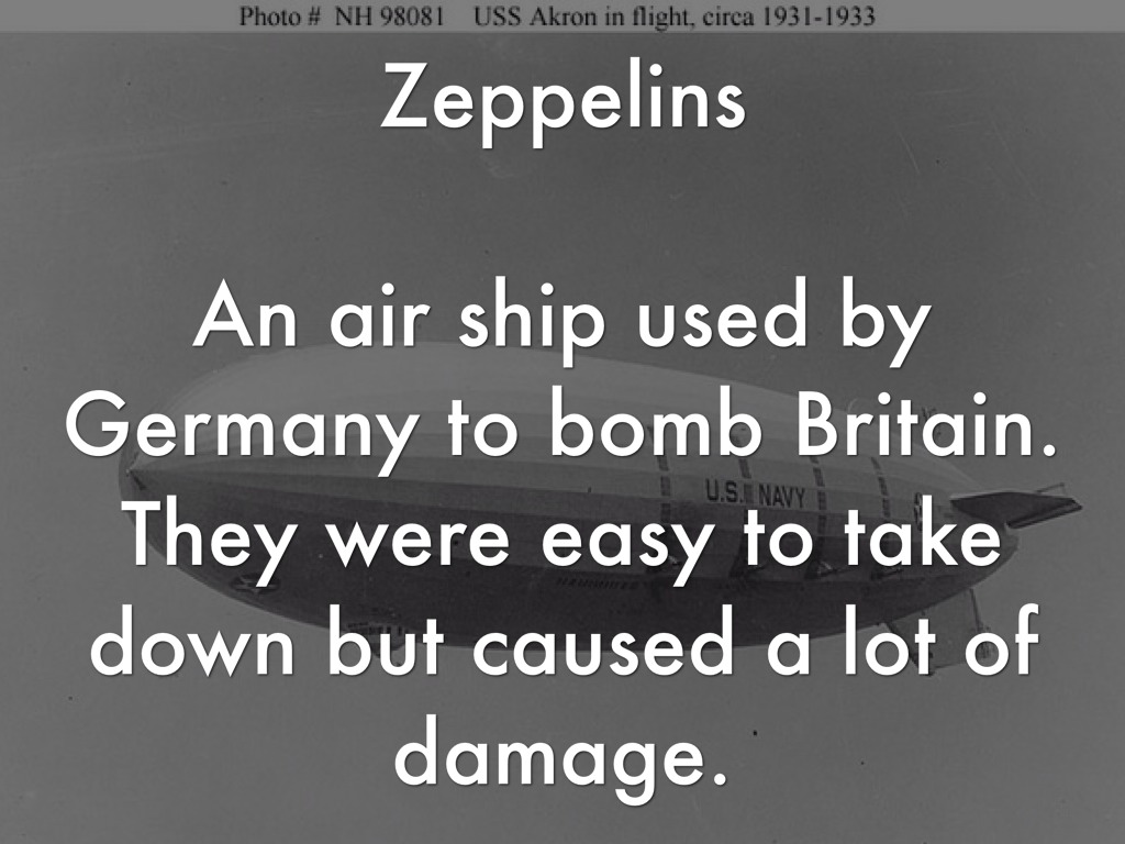 An air ship used by Germany to bomb Britain. They were easy to take down but caused a lot of damage.