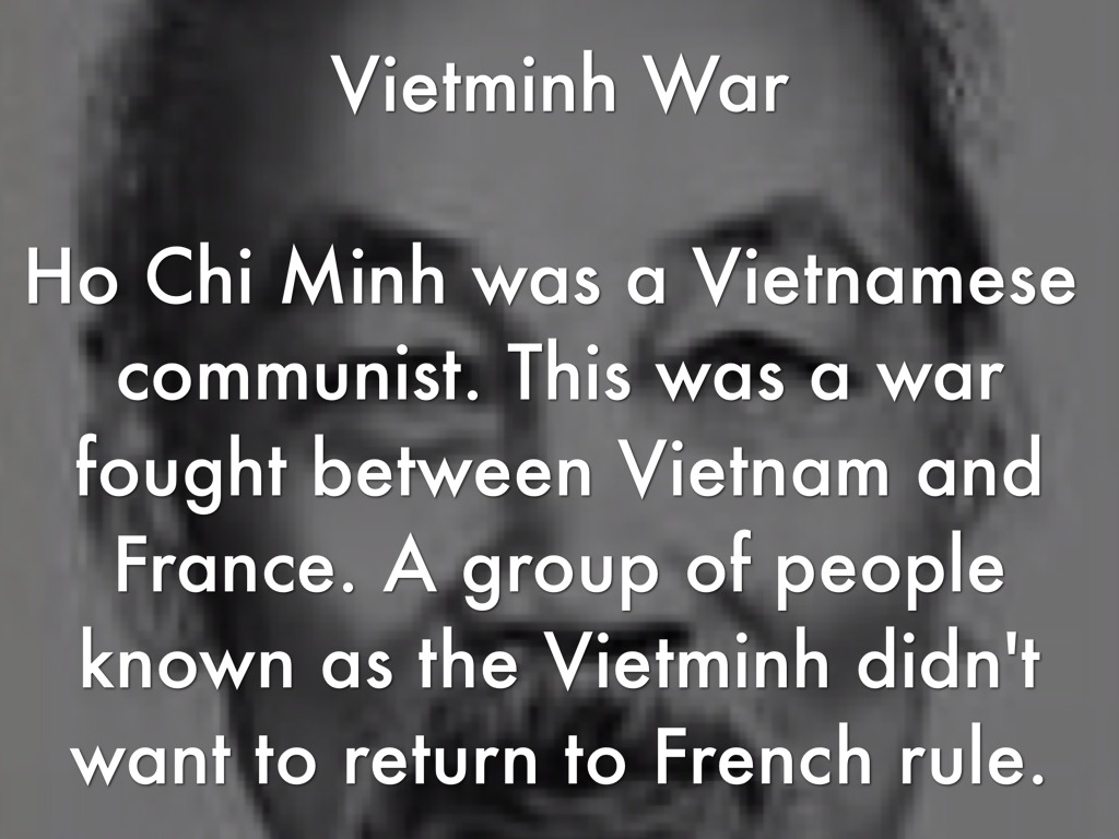 Ho Chi Minh was a Vietnamese communist. This was a war fought between Vietnam and France. A group of people known as the Vietminh didn't want to return to French rule.