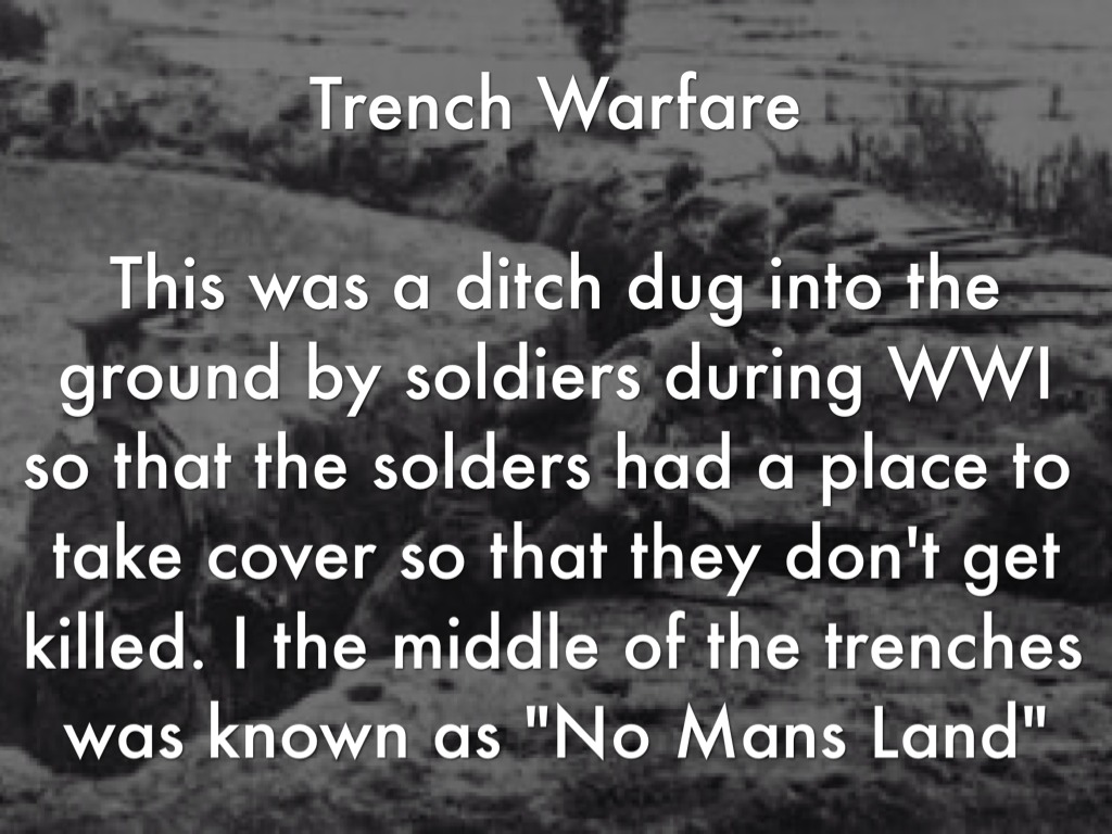 This was a ditch dug into the ground by soldiers during WWI so that the solders had a place to take cover so that they don't get killed. I the middle of the trenches was known as "No Mans Land"