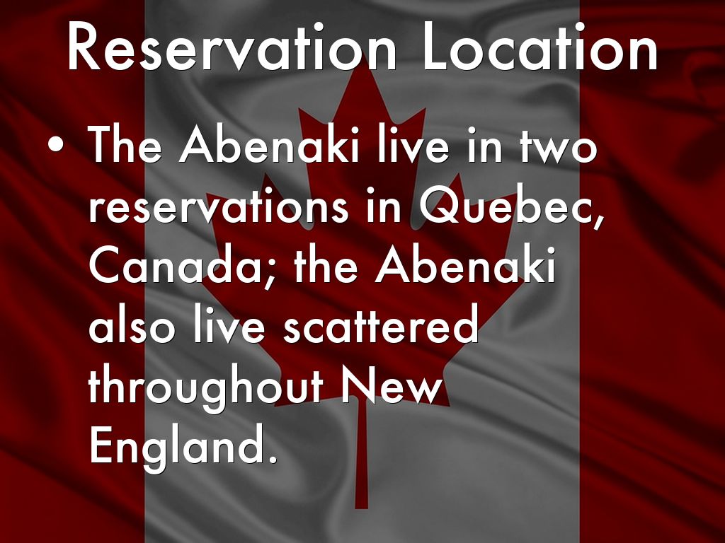 The Abenaki live in two reservations in Quebec, Canada; the Abenaki also live scattered throughout New England.