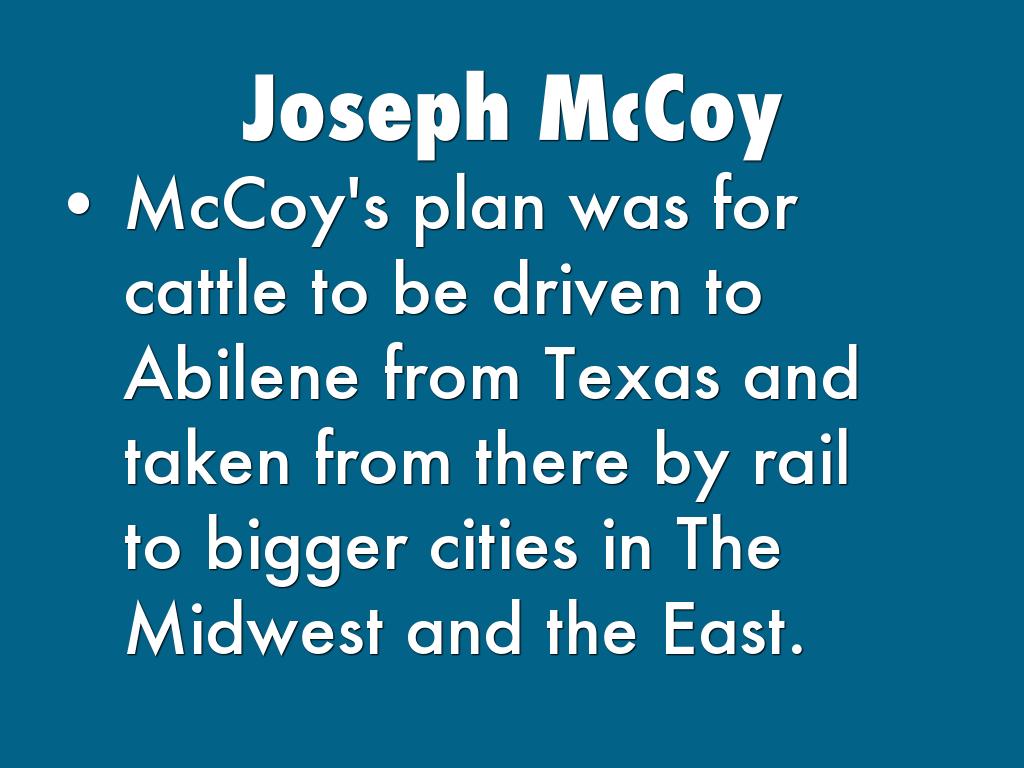 McCoy's plan was for cattle to be driven to Abilene from Texas and taken from there by rail to bigger cities in The Midwest and the East.