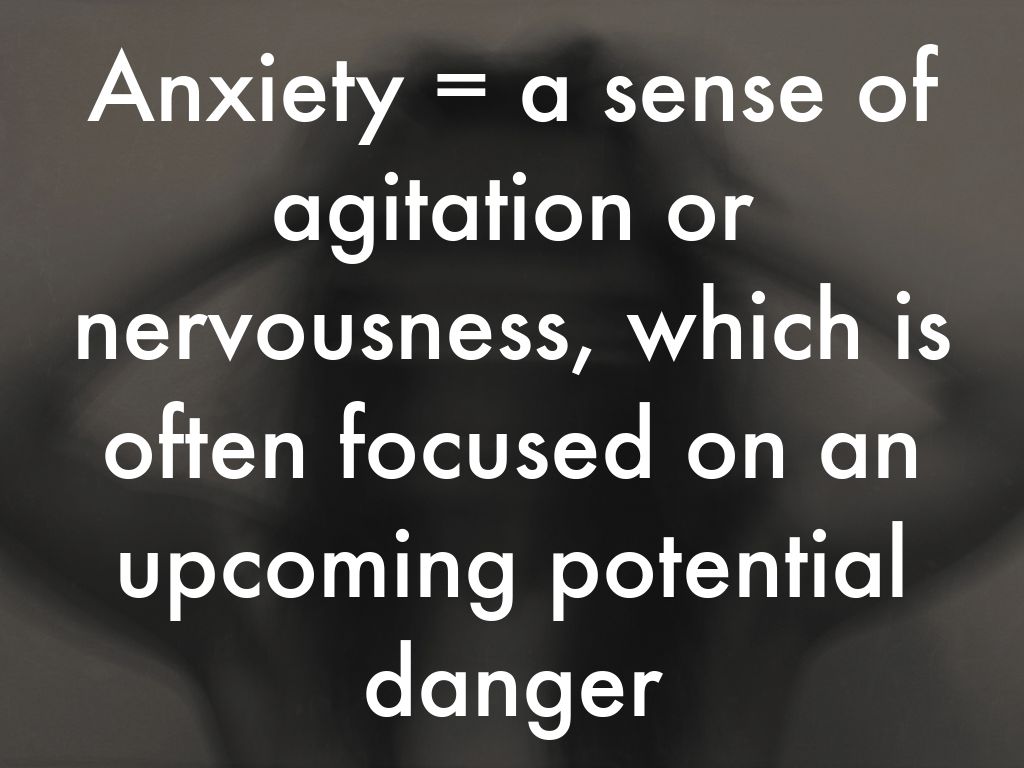Anxiety = a sense of agitation or nervousness, which is often focused on an upcoming potential danger