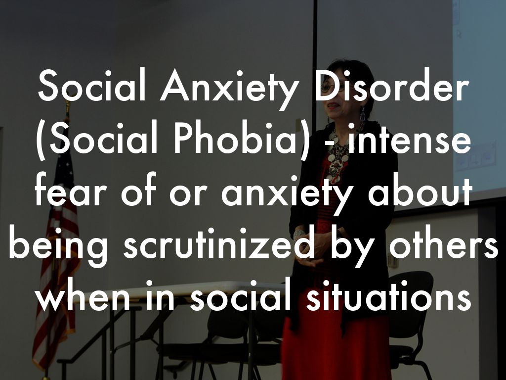 Social Anxiety Disorder (Social Phobia) - intense fear of or anxiety about being scrutinized by others when in social situations