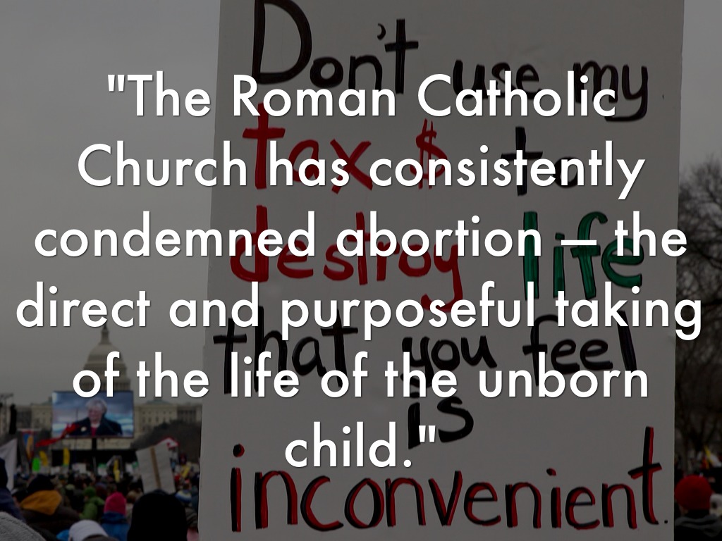 "The Roman Catholic Church has consistently condemned abortion — the direct and purposeful taking of the life of the unborn child."