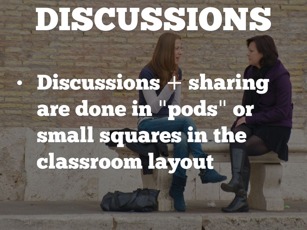 • Discussions + sharing are done in "pods" or small squares in the classroom layout