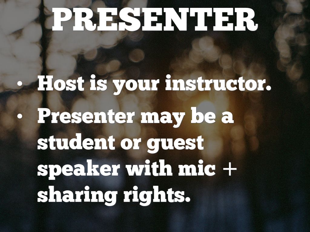 • Presenter may be a student or guest speaker with mic + sharing rights.