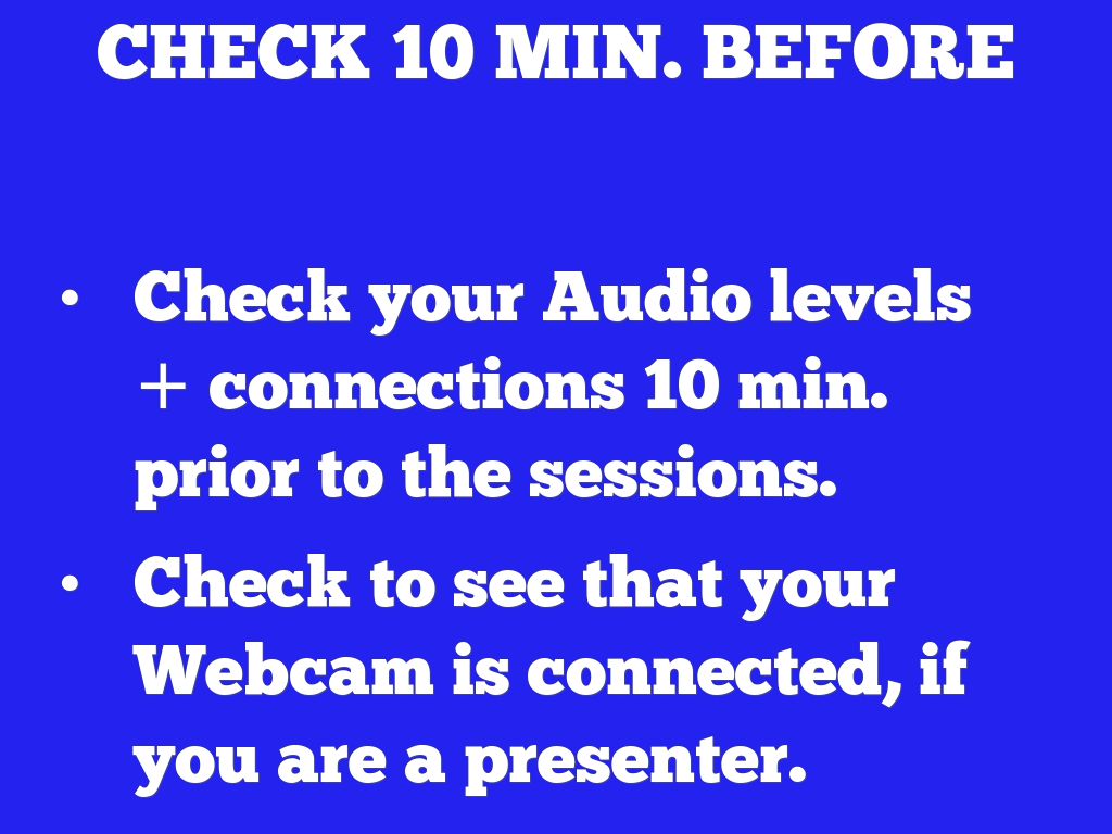 • Check your Audio levels + connections 10 min. prior to the sessions.