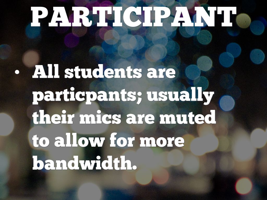 • All students are particpants; usually their mics are muted to allow for more bandwidth.