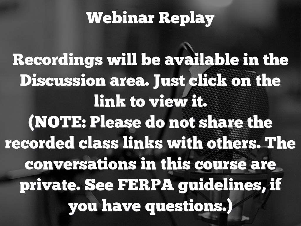 (NOTE: Please do not share the recorded class links with others. The conversations in this course are private. See FERPA guidelines, if you have questions.)