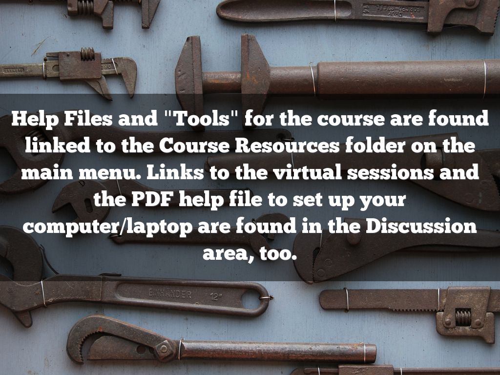 Help Files and "Tools" for the course are found linked to the Course Resources folder on the main menu. Links to the virtual sessions and the PDF help file to set up your computer/laptop are found in the Discussion area, too.