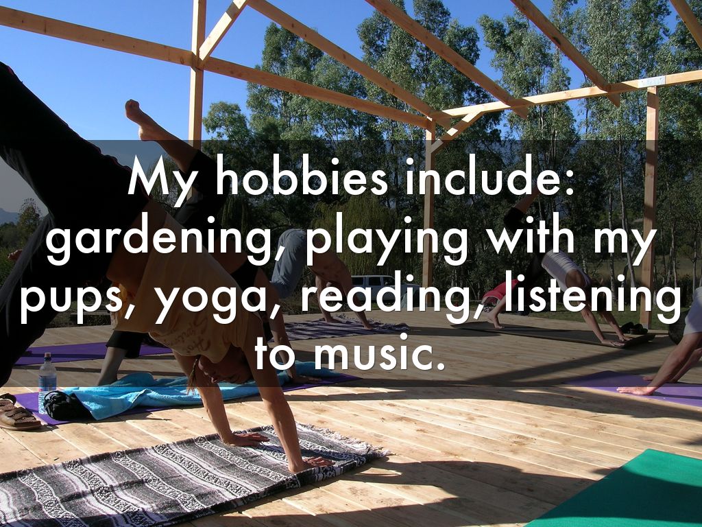 My hobbies include: gardening, playing with my pups, yoga, reading, listening to music.