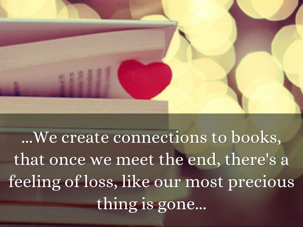 ...We create connections to books, that once we meet the end, there's a feeling of loss, like our most precious thing is gone...