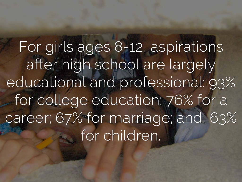 For girls ages 8-12, aspirations after high school are largely educational and professional: 93% for college education; 76% for a career; 67% for marriage; and, 63% for children.