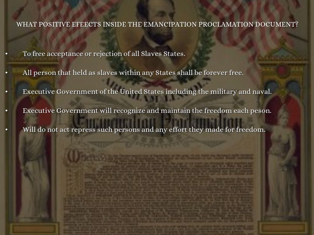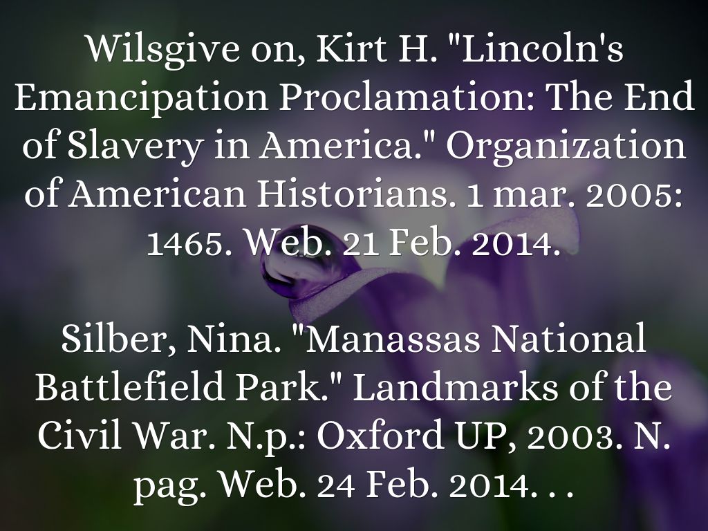 Wilsgive on, Kirt H. "Lincoln's Emancipation Proclamation: The End of Slavery in America." Organization of American Historians. 1 mar. 2005: 1465. Web. 21 Feb. 2014.