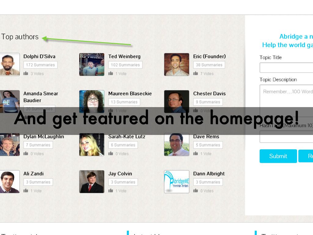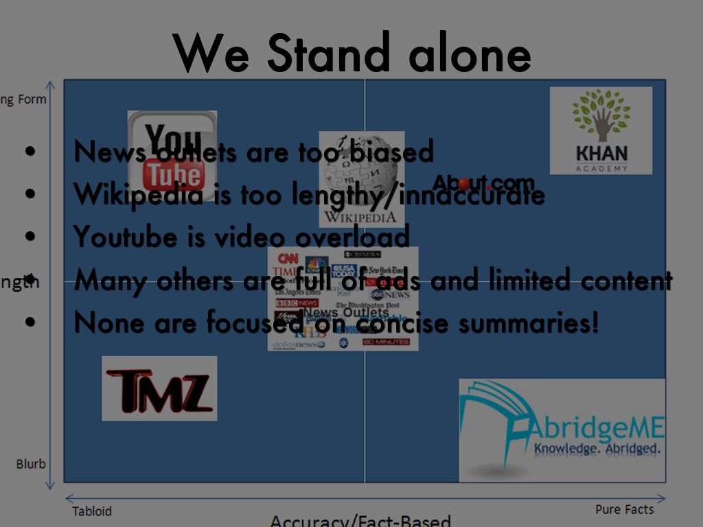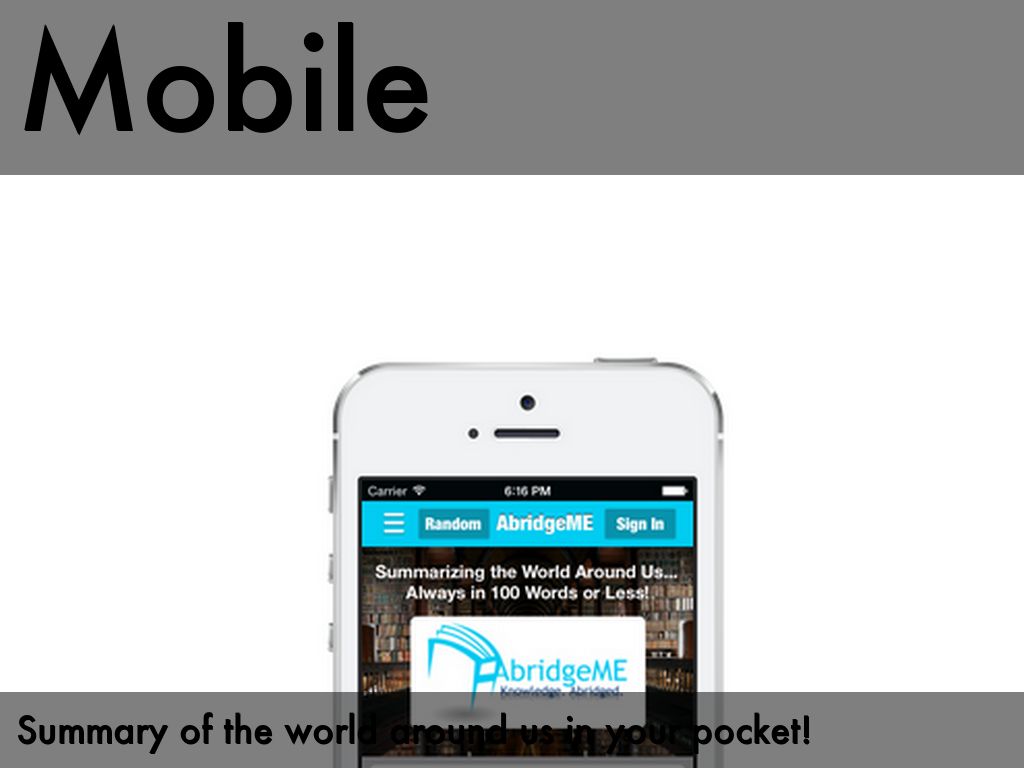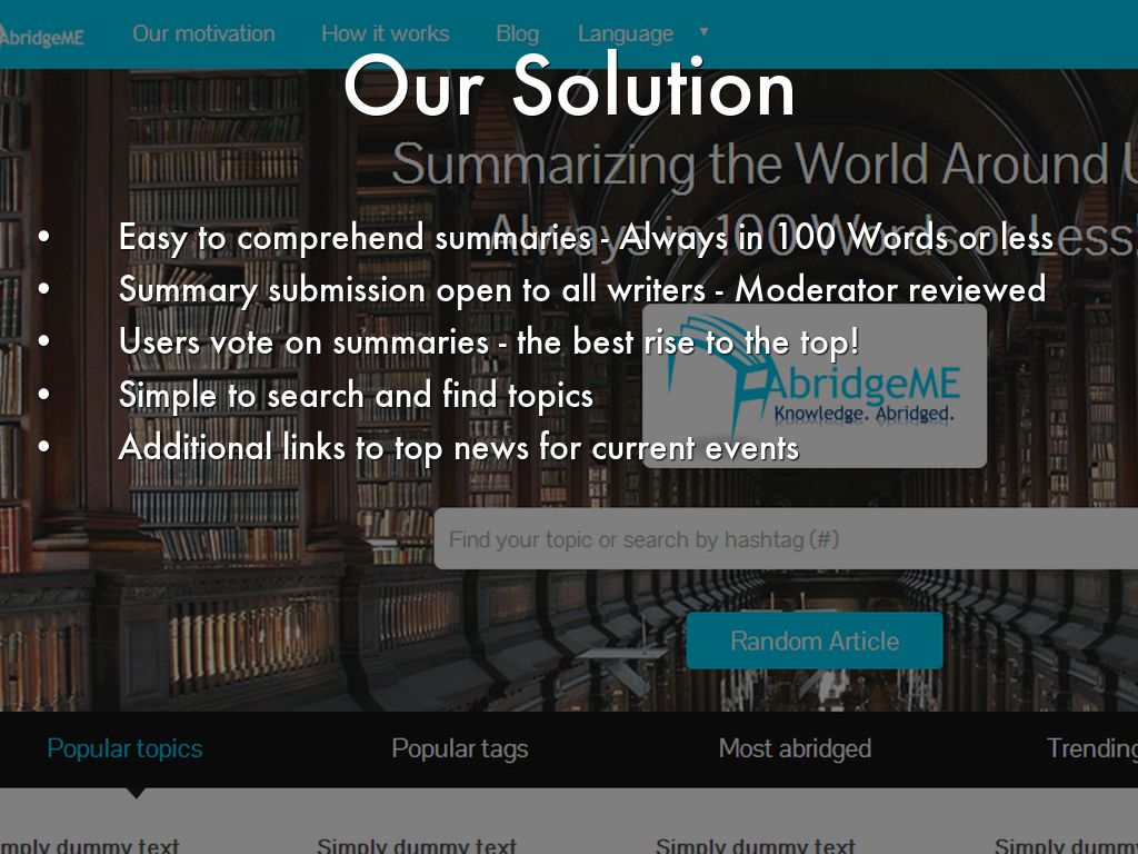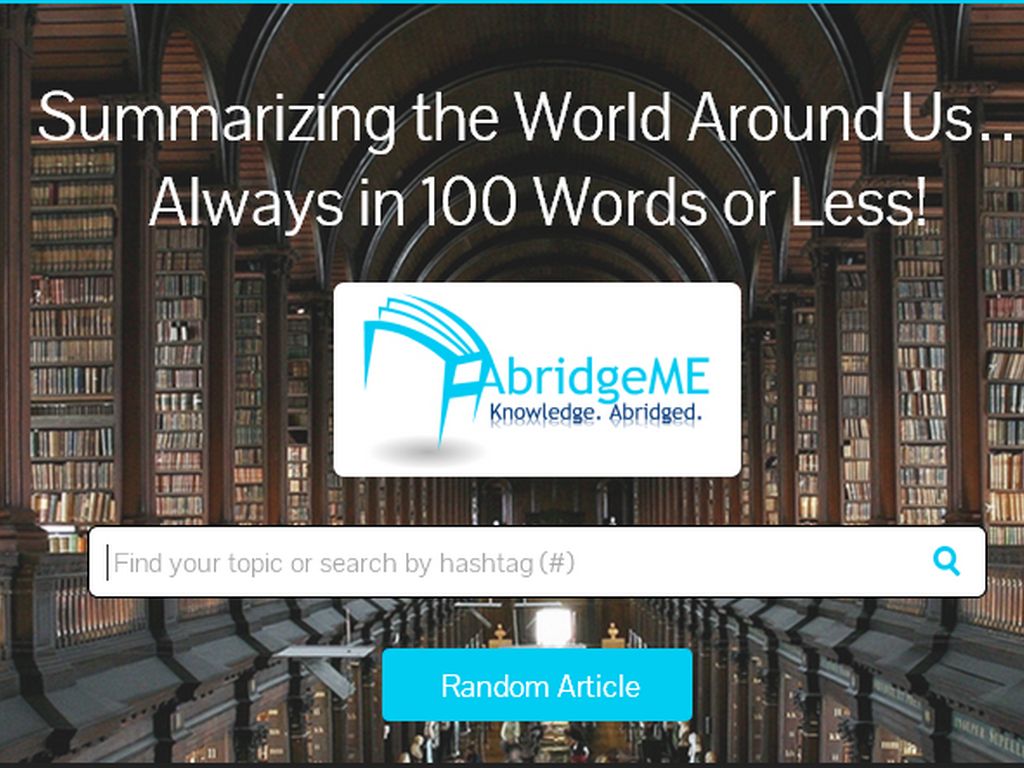 The AbridgeME.com crowdsourced knowledge platform will deliver to the web entirely unbiased and concise summaries of the world’s most discussed topics (current and past) for any reader to quickly absorb - Always in 100 words or less!