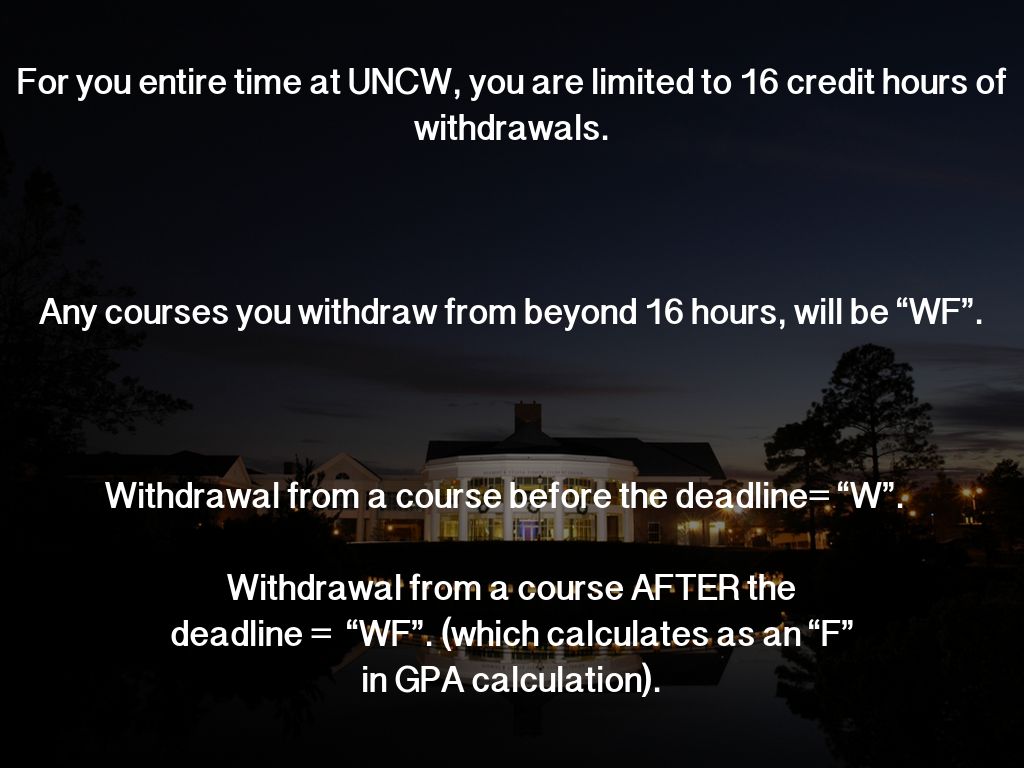 For you entire time at UNCW, you are limited to 16 credit hours of withdrawals.