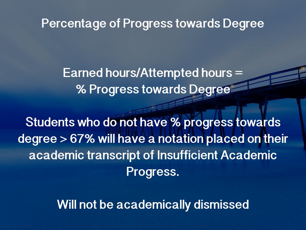 degree > 67% will have a notation placed on their academic transcript of Insufficient Academic Progress.