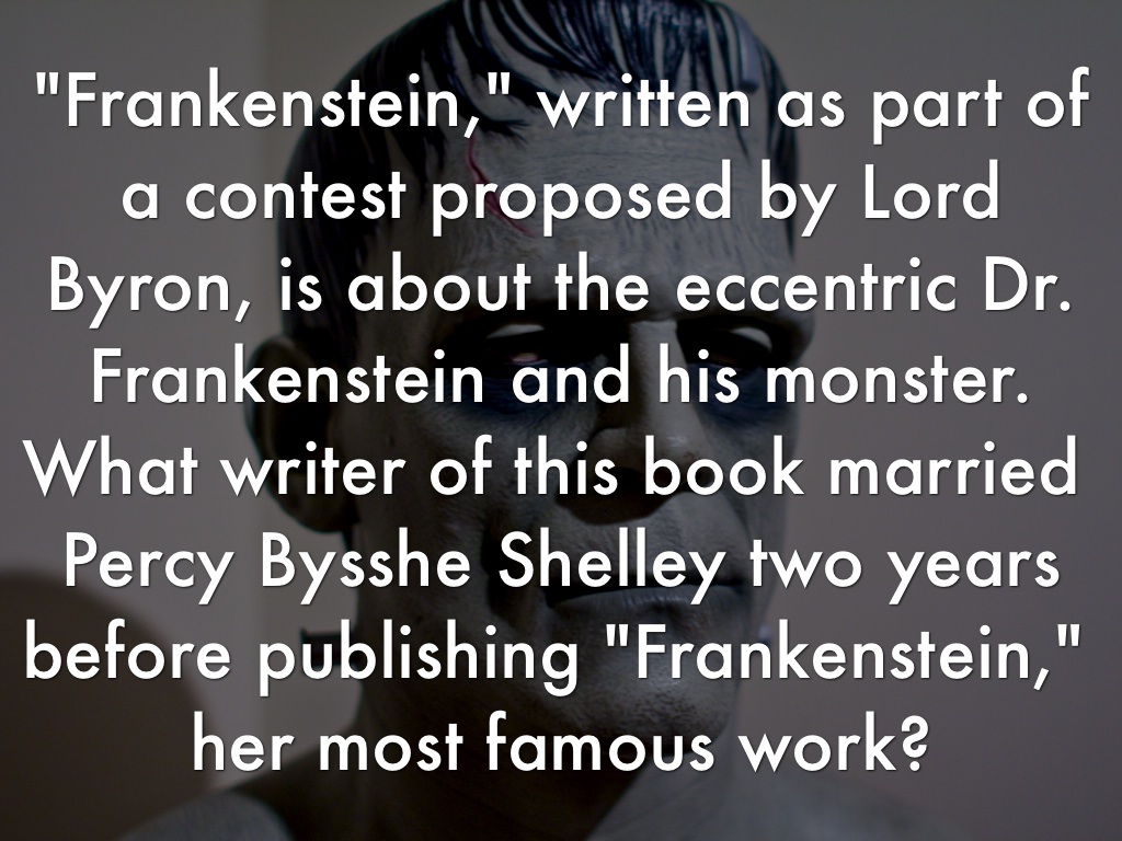 "Frankenstein," written as part of a contest proposed by Lord Byron, is about the eccentric Dr. Frankenstein and his monster. What writer of this book married Percy Bysshe Shelley two years before publishing "Frankenstein," her most famous work?