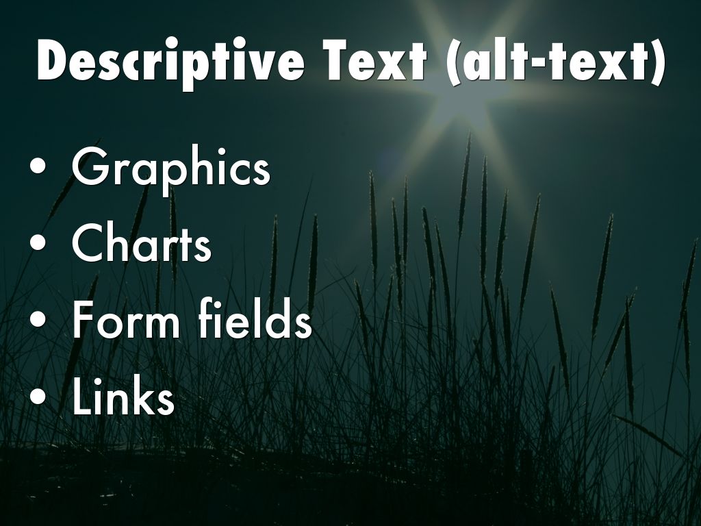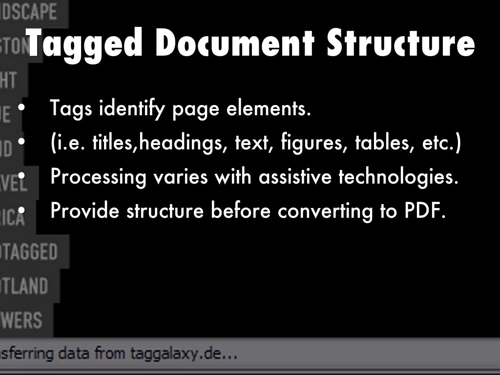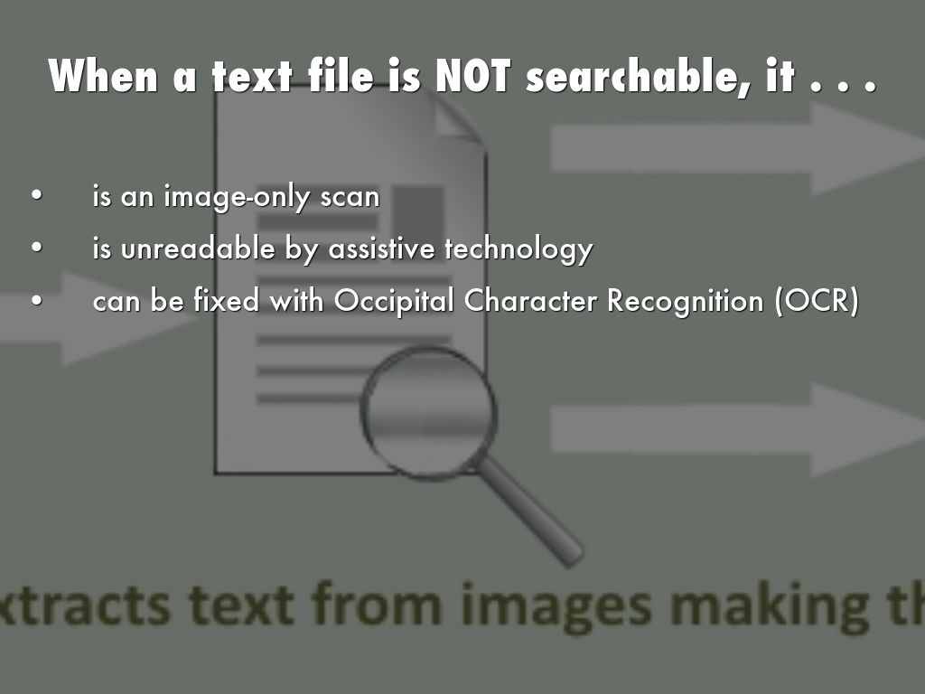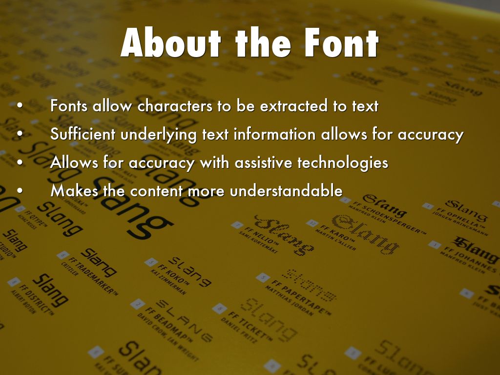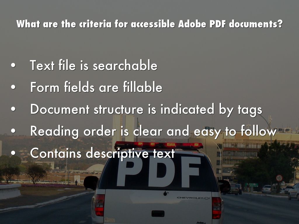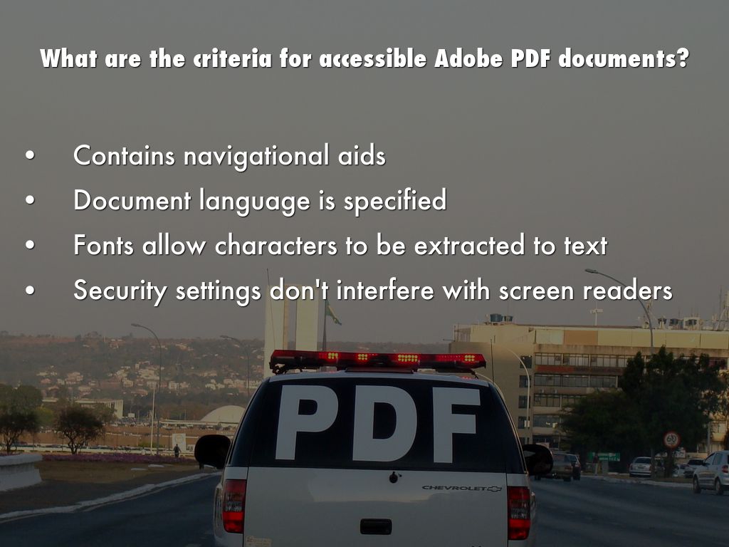 Another characteristic of an accessible Adobe PDF document is that the fonts within it contain enough information for Adobe Reader or Acrobat to correctly extract all the characters to text for purposes other than displaying text on