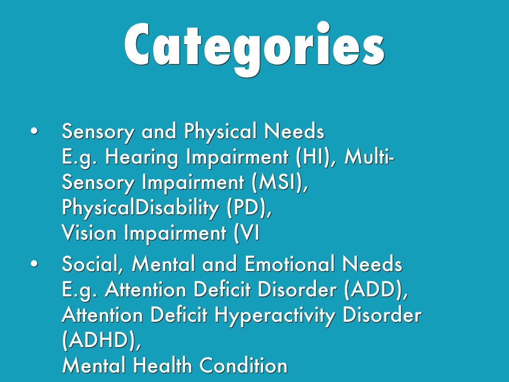 Social, Mental and Emotional Needs E.g. Attention Deficit Disorder (ADD), Attention Deficit Hyperactivity Disorder (ADHD), Mental Health Condition