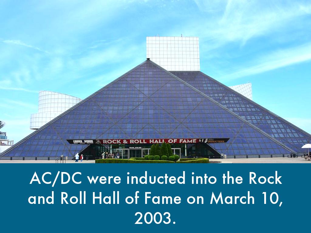 AC/DC were inducted into the Rock and Roll Hall of Fame on March 10, 2003.