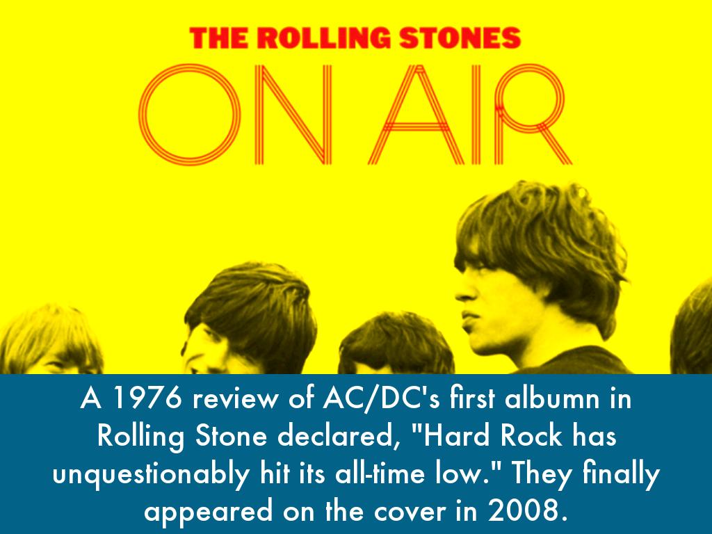 A 1976 review of AC/DC's first albumn in Rolling Stone declared, "Hard Rock has unquestionably hit its all-time low." They finally appeared on the cover in 2008.