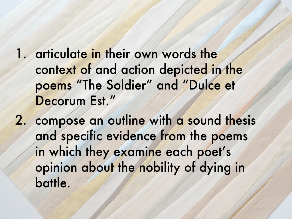articulate in their own words the context of and action depicted in the poems “The Soldier” and “Dulce et Decorum Est.”