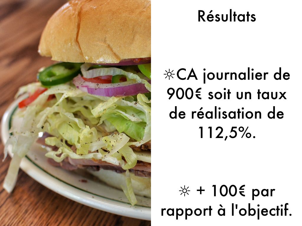 ☼CA journalier de 900€ soit un taux de réalisation de 112,5%.
