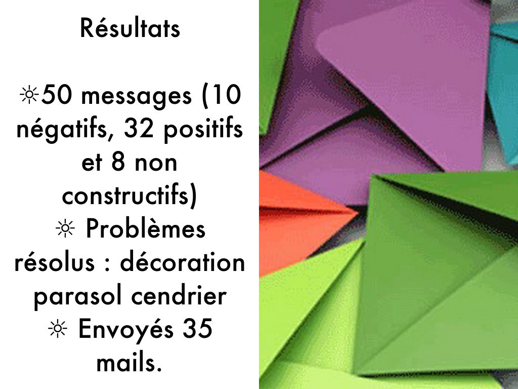 ☼50 messages (10 négatifs, 32 positifs et 8 non constructifs)