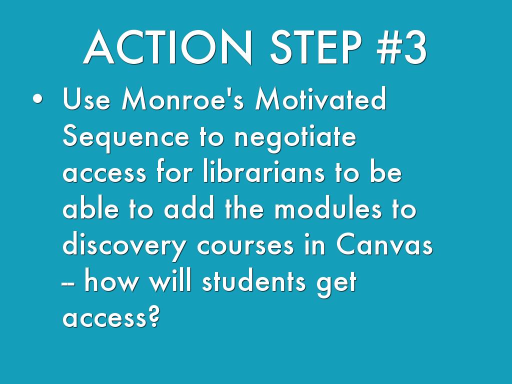 Use Monroe's Motivated Sequence to negotiate access for librarians to be able to add the modules to discovery courses in Canvas -- how will students get access?