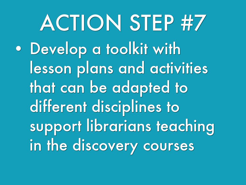 Develop a toolkit with lesson plans and activities that can be adapted to different disciplines to support librarians teaching in the discovery courses