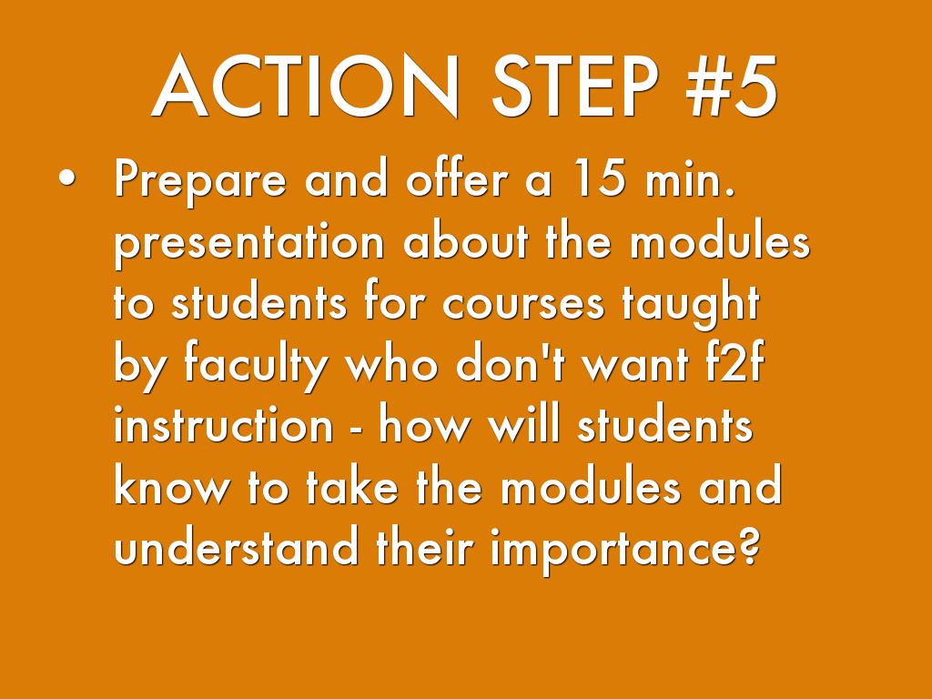 Prepare and offer a 15 min. presentation about the modules to students for courses taught by faculty who don't want f2f instruction - how will students know to take the modules and understand their importance?