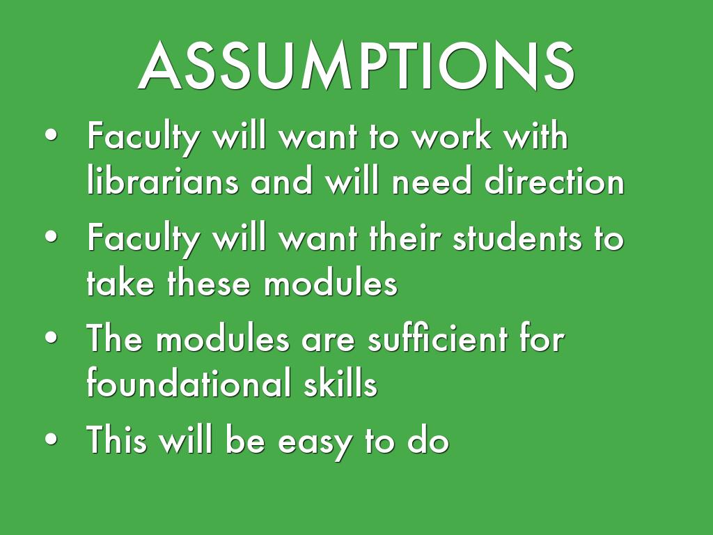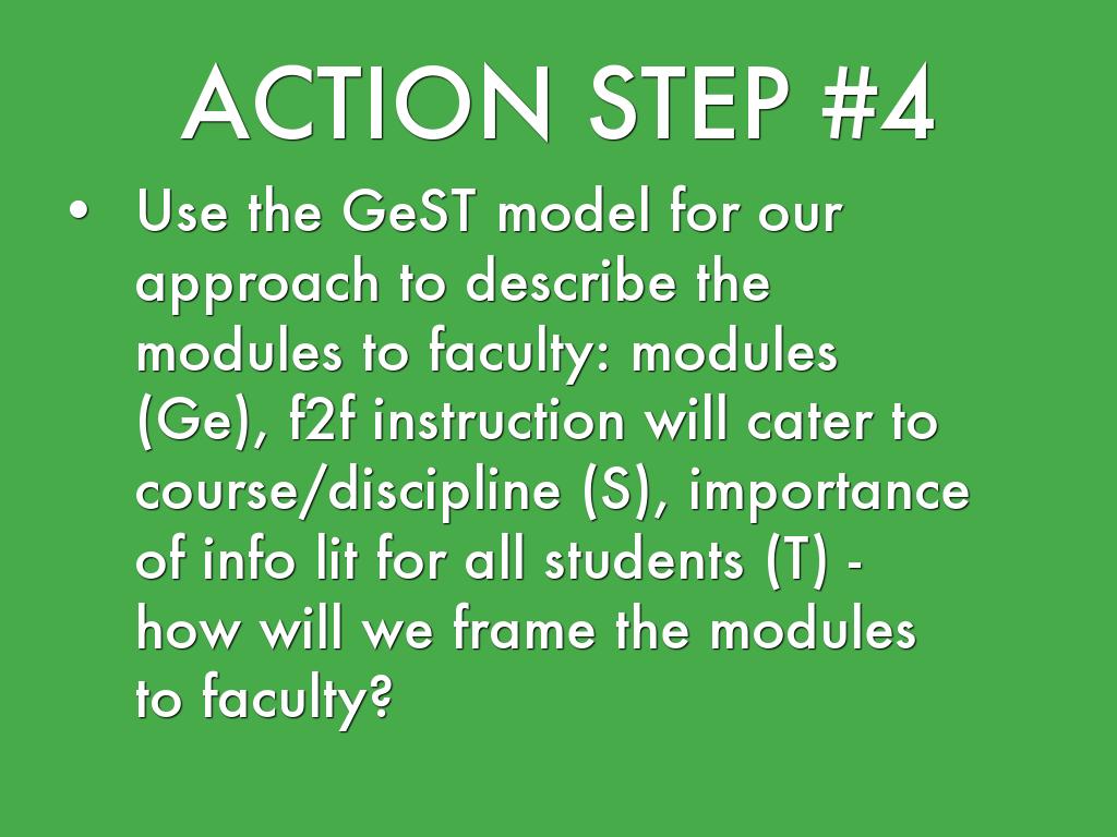 Use the GeST model for our approach to describe the modules to faculty: modules (Ge), f2f instruction will cater to course/discipline (S), importance of info lit for all students (T) - how will we frame the modules to faculty?