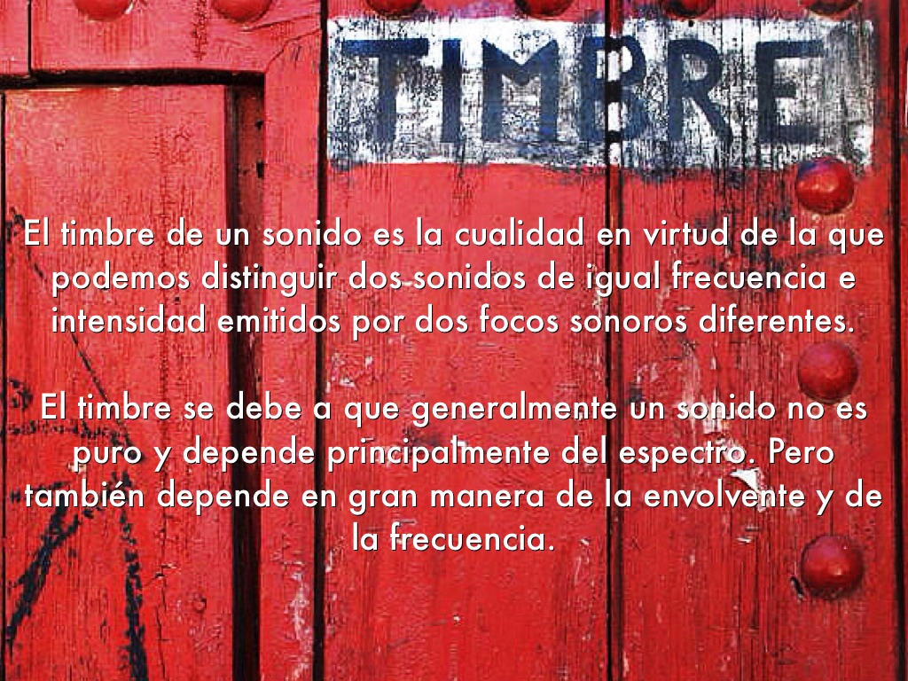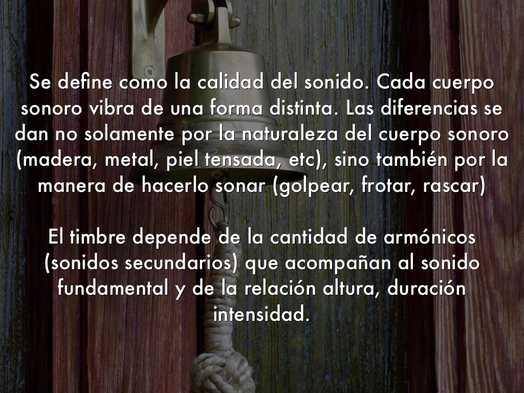 El timbre depende de la cantidad de armónicos (sonidos secundarios) que acompañan al sonido fundamental y de la relación altura, duración intensidad.