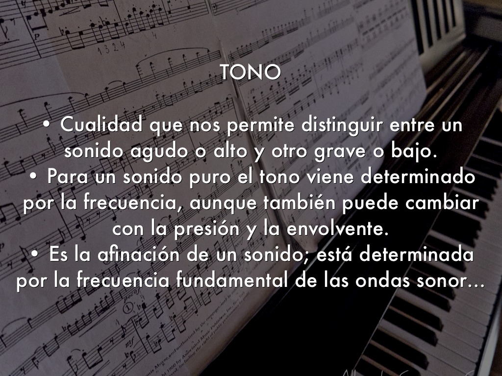 • Cualidad que nos permite distinguir entre un sonido agudo o alto y otro grave o bajo. • Para un sonido puro el tono viene determinado por la frecuencia, aunque también puede cambiar con la presión y la envolvente. • Es la afinación de un sonido; está determinada por la frecuencia fundamental de las ondas sonoras