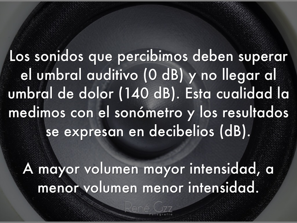 Los sonidos que percibimos deben superar el umbral auditivo (0 dB) y no llegar al umbral de dolor (140 dB). Esta cualidad la medimos con el sonómetro y los resultados se expresan en decibelios (dB).