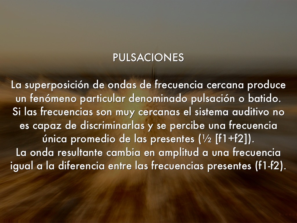 La superposición de ondas de frecuencia cercana produce un fenómeno particular denominado pulsación o batido. Si las frecuencias son muy cercanas el sistema auditivo no es capaz de discriminarlas y se percibe una frecuencia única promedio de las presentes (½ [f1+f2]). La onda resultante cambia en amplitud a una frecuencia igual a la diferencia entre las frecuencias presentes (f1-f2).
