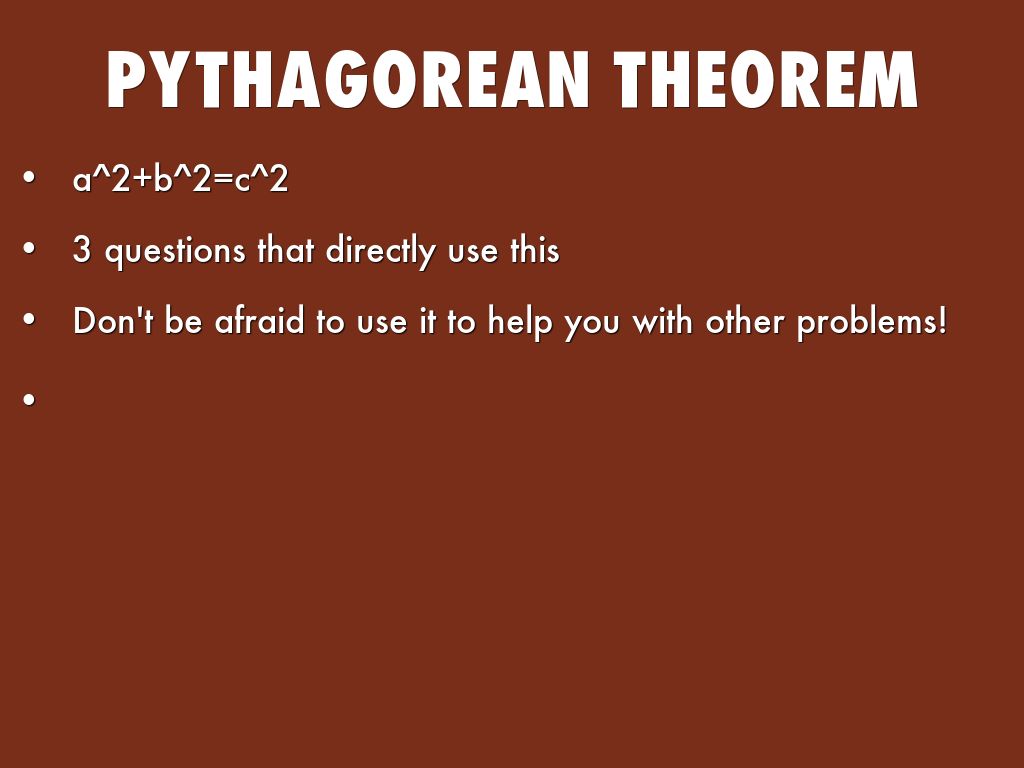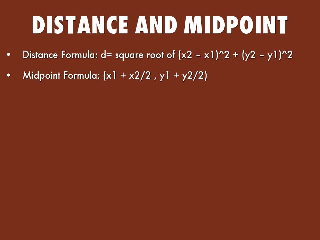Distance Formula: d= square root of (x2 – x1)^2 + (y2 – y1)^2