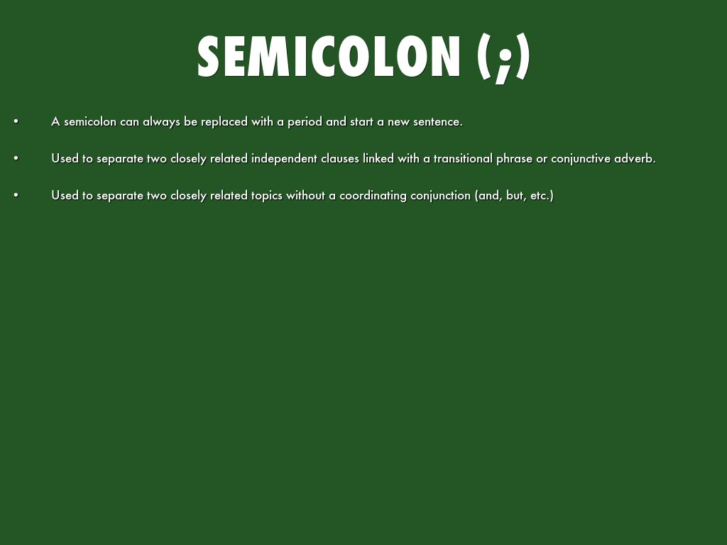 Used to separate two closely related topics without a coordinating conjunction (and, but, etc.)