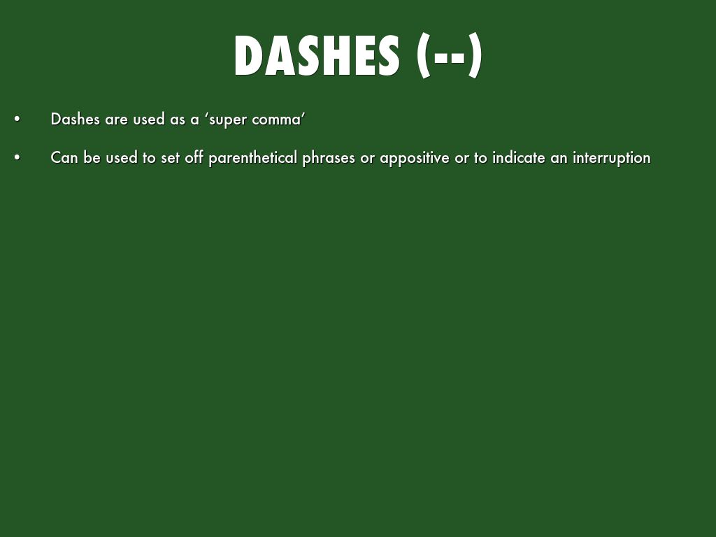 Can be used to set off parenthetical phrases or appositive or to indicate an interruption