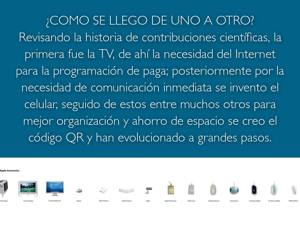 Revisando la historia de contribuciones científicas, la primera fue la TV, de ahí la necesidad del Internet para la programación de paga; posteriormente por la necesidad de comunicación inmediata se invento el celular, seguido de estos entre muchos otros para mejor organización y ahorro de espacio se creo el código QR y han evolucionado a grandes pasos.