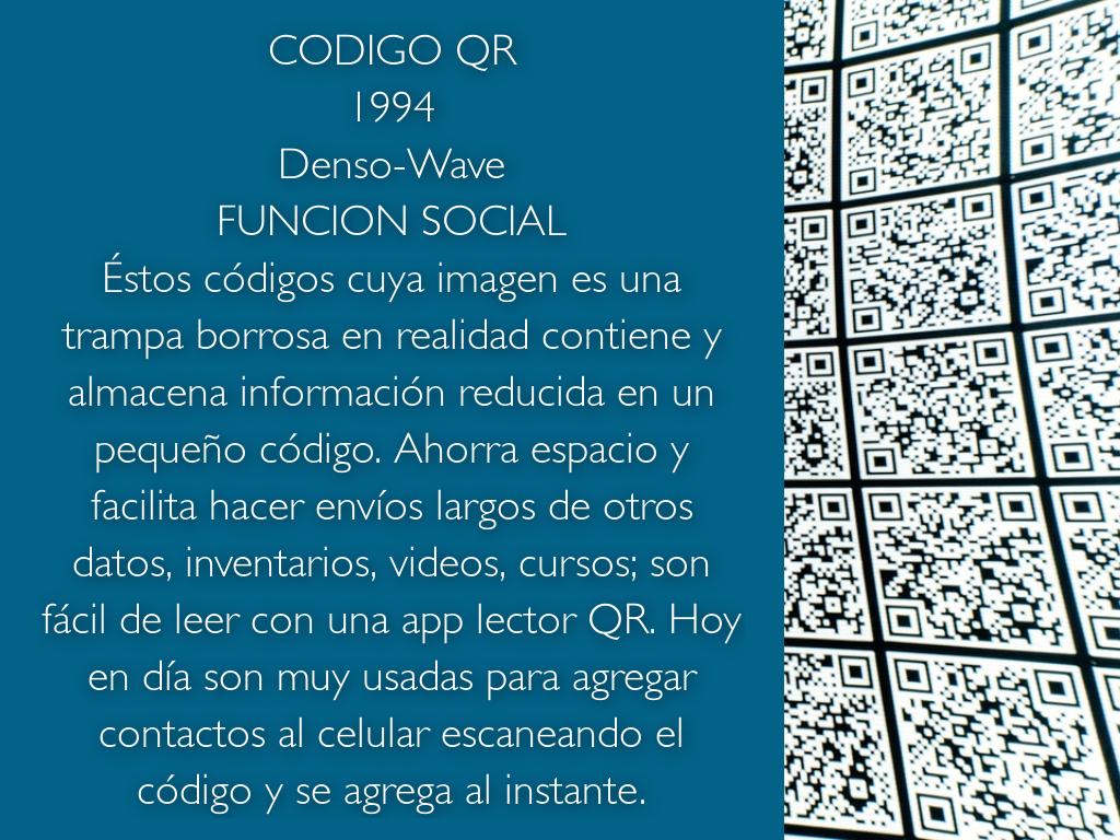 Éstos códigos cuya imagen es una trampa borrosa en realidad contiene y almacena información reducida en un pequeño código. Ahorra espacio y facilita hacer envíos largos de otros datos, inventarios, videos, cursos; son fácil de leer con una app lector QR. Hoy en día son muy usadas para agregar contactos al celular escaneando el código y se agrega al instante.