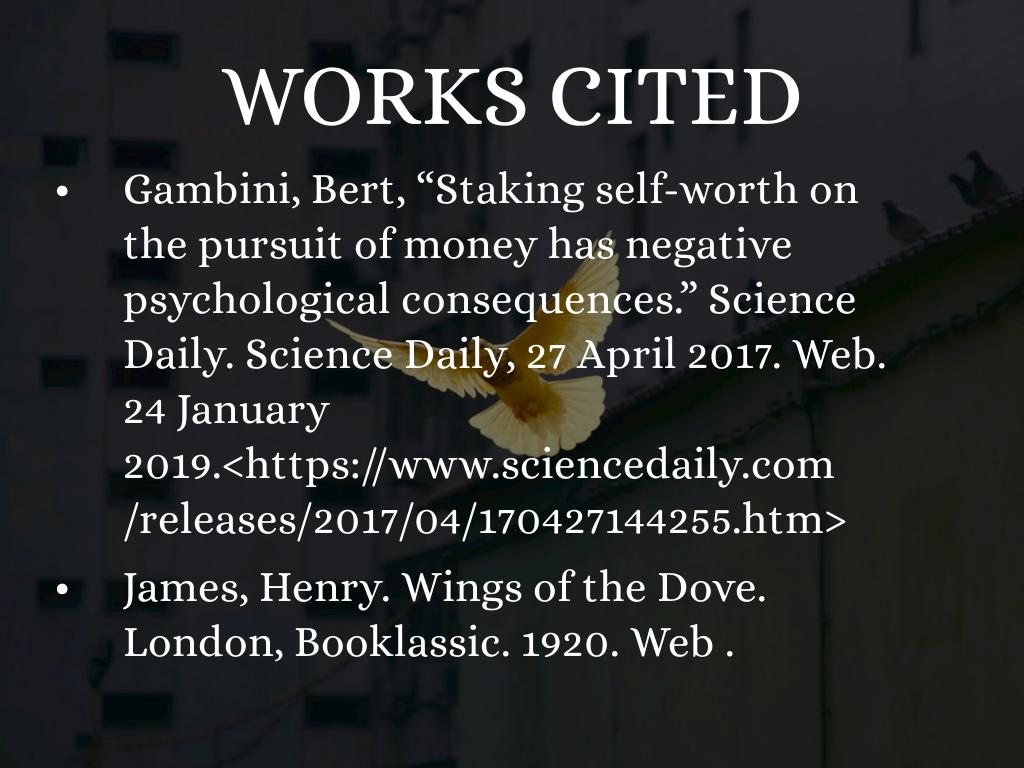 This relates to the novel by showing how the characters such as Lord Mark and Kate are trying to pursuit money from their so called friend Milly. Lord Mark tries all he can to marry Milly just for her money, and that only. He partially focuses on her beauty but his main focus is her money. Kate on the other hand is trying her hardest get her hands on Milly’s money all for herself. She betrays Milly and has her thinking they are close friends when in reality Kate is just as focused on the money than Lord Mark.