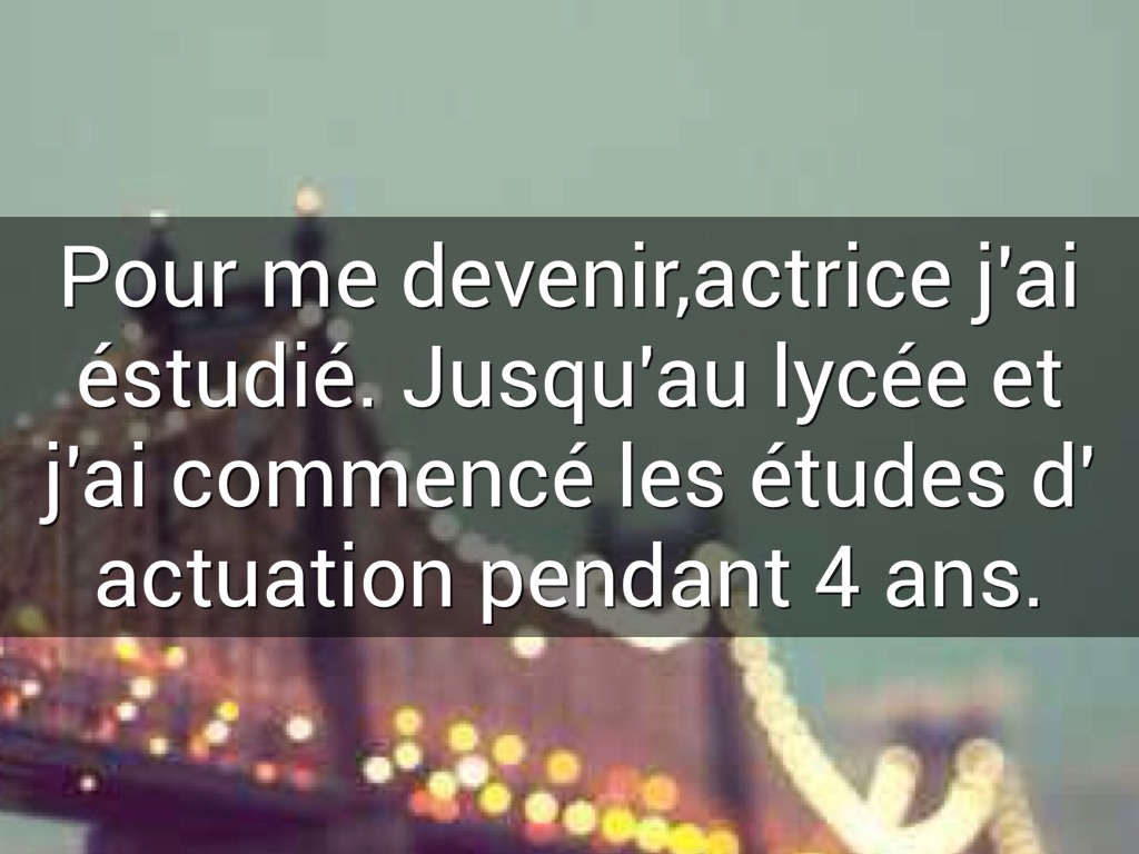 Pour me devenir,actrice j'ai éstudié. Jusqu'au lycée et j'ai commencé les études d' actuation pendant 4 ans.