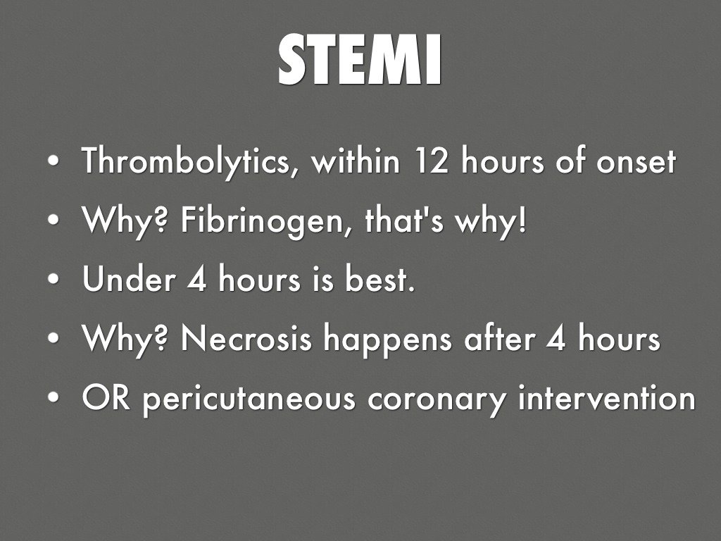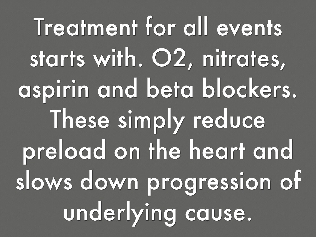 Treatment for all events starts with. O2, nitrates, aspirin and beta blockers.