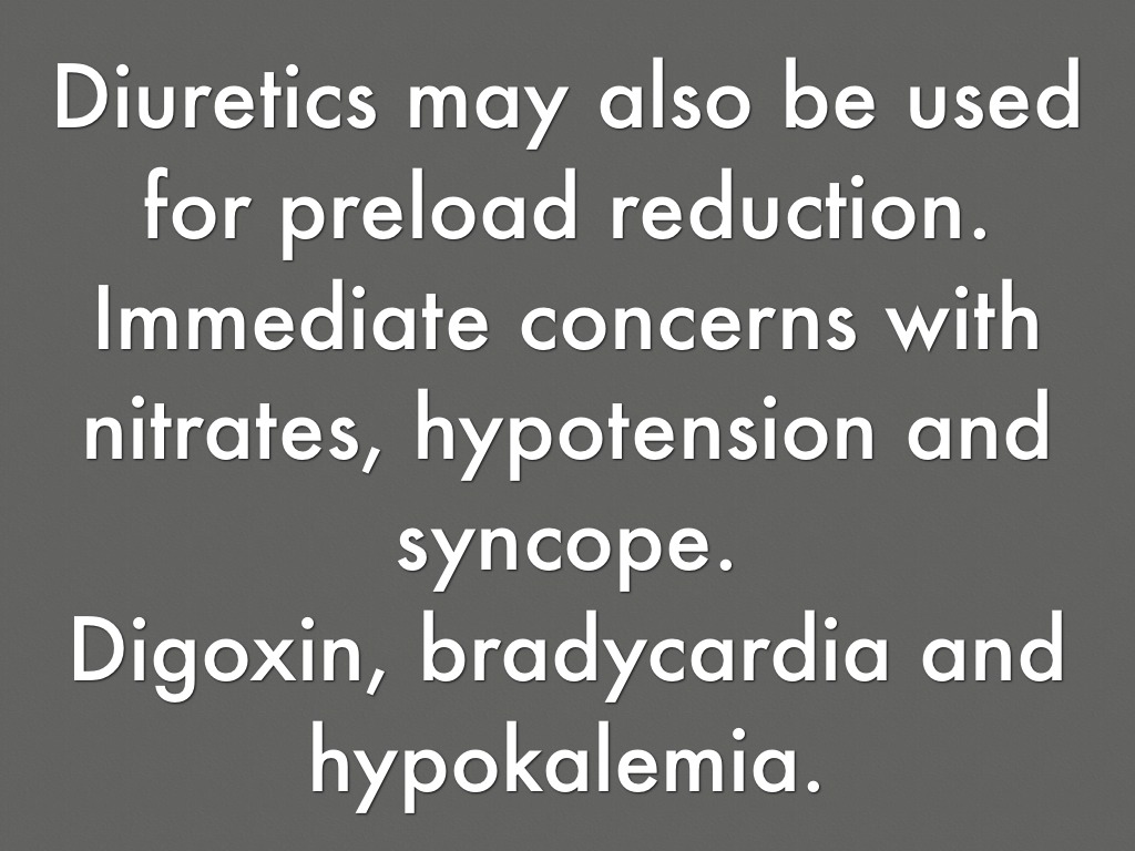 Diuretics may also be used for preload reduction. Immediate concerns with nitrates, hypotension and syncope.