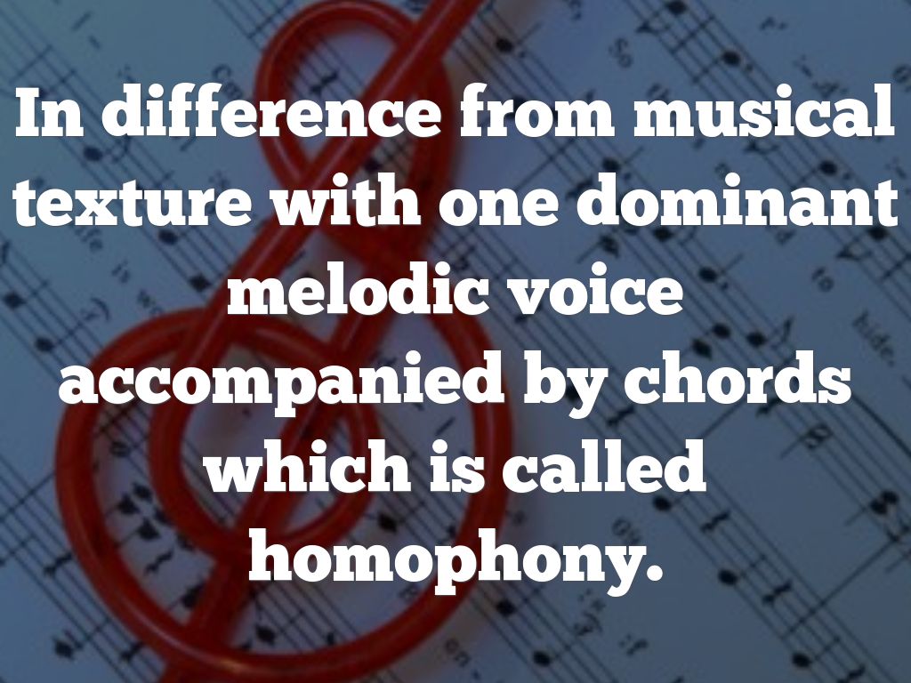 In difference from musical texture with one dominant melodic voice accompanied by chords which is called homophony.
