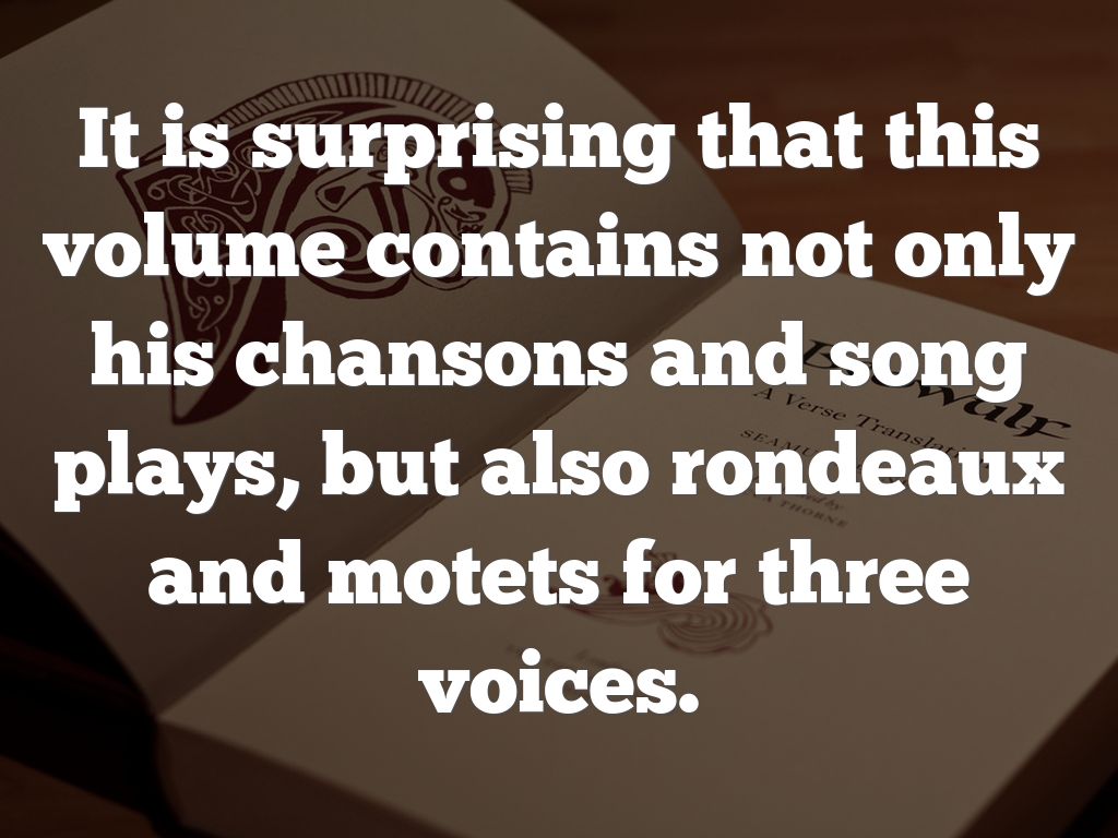 It is surprising that this volume contains not only his chansons and song plays, but also rondeaux and motets for three voices.