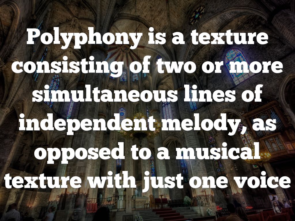 Polyphony is a texture consisting of two or more simultaneous lines of independent melody, as opposed to a musical texture with just one voice